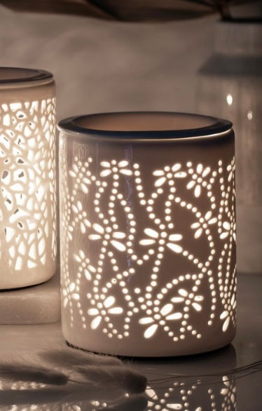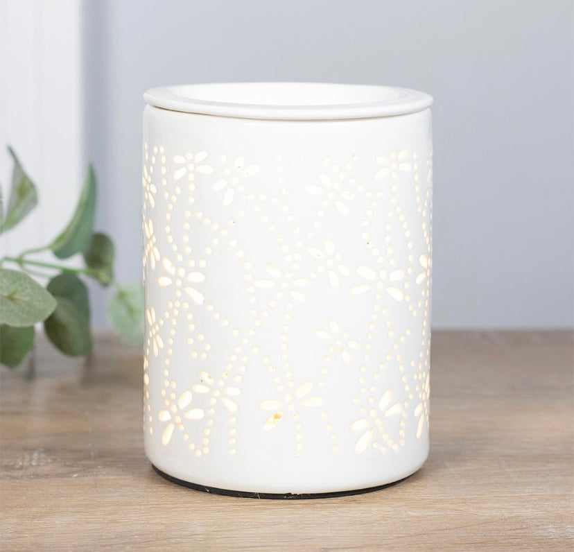 This elegant, electric burner lights up to showcase a sweet dragonfly. To use, place on a level and heat resistant surface before placing wax melts in the ceramic dish and plugging in burner. Unplug when not in use and let cool completely before moving or cleaning removable dish with warm, soapy water. Depth of dish - 2cm.